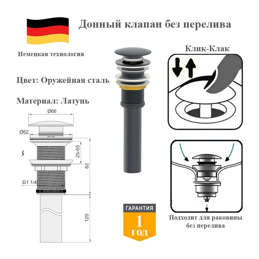 Стильное и практичное решение для ванной комнаты — донный клапан с механизмом «клик‑клак» без перелива. Сочетание покрытия «оружейная сталь», прочной латунной основы и продуманной механики обеспечивает удобство эксплуатации и гармоничное сочетание с различными интерьерными решениями.