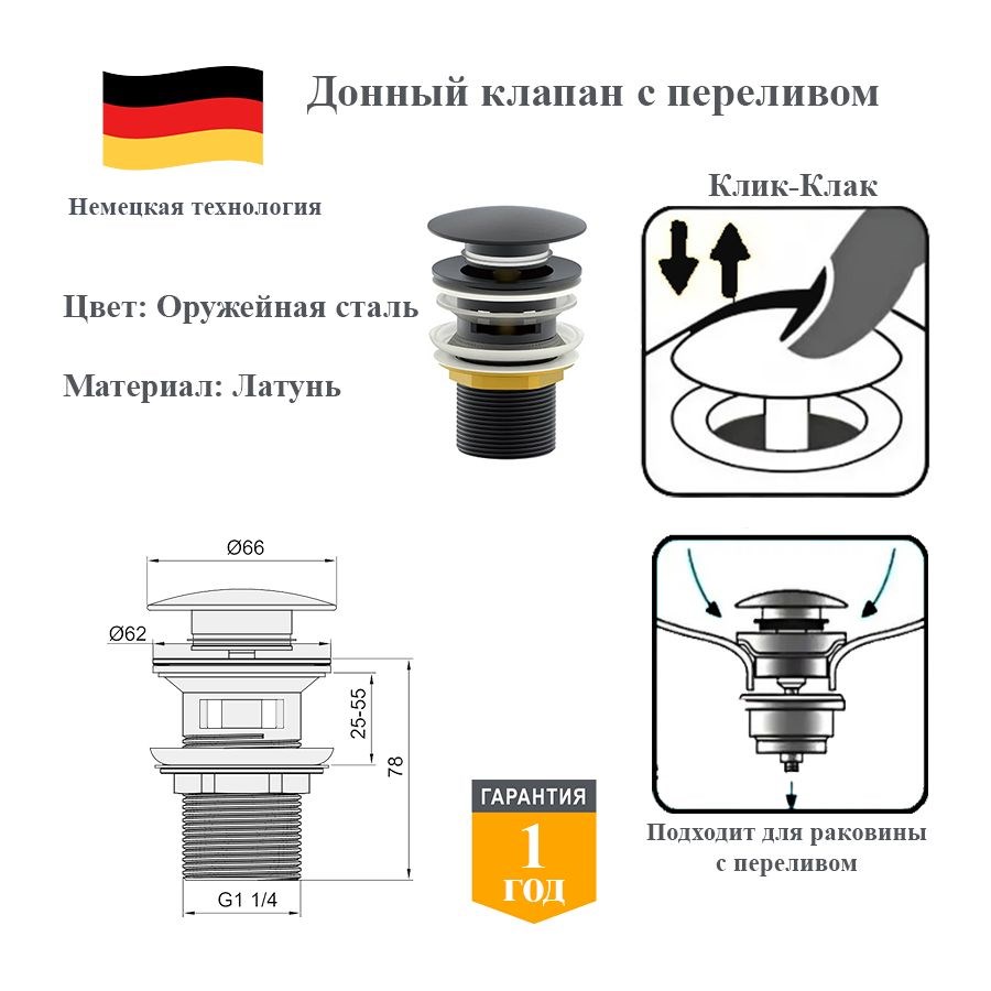 Тип: донный клапан с переливом и механизмом «клик‑клак».