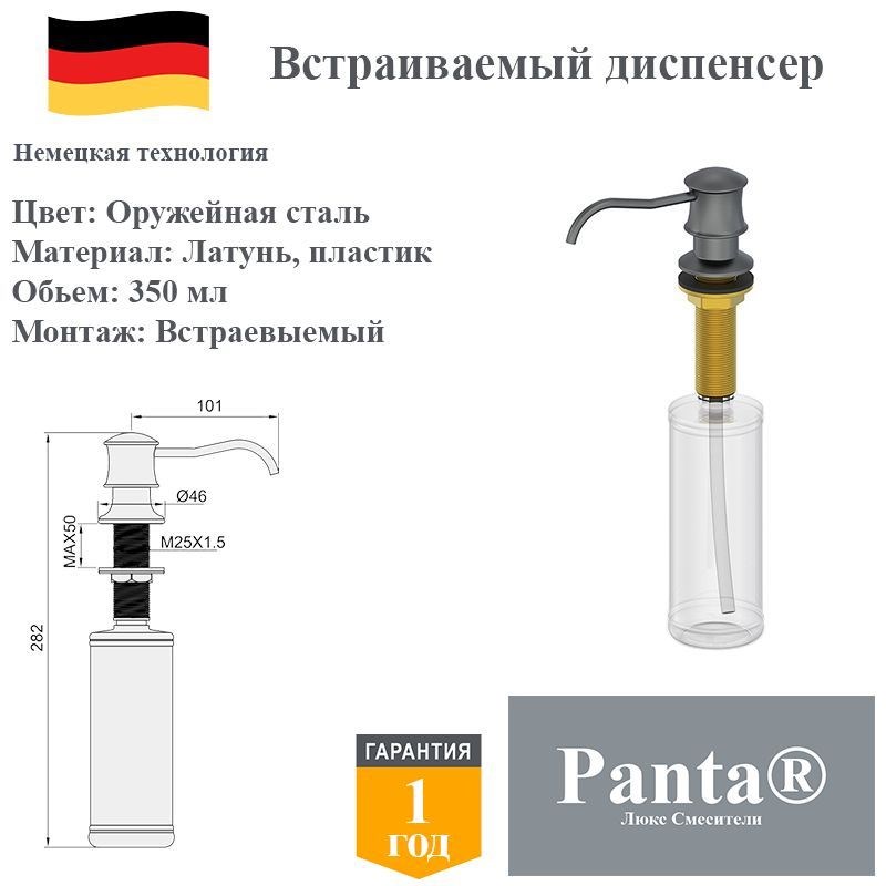 Дозатор для моющего средства на кухню встраиваемый, диспенсер для жидкого мыла Panta PT-SD03-BGM оружейная сталь