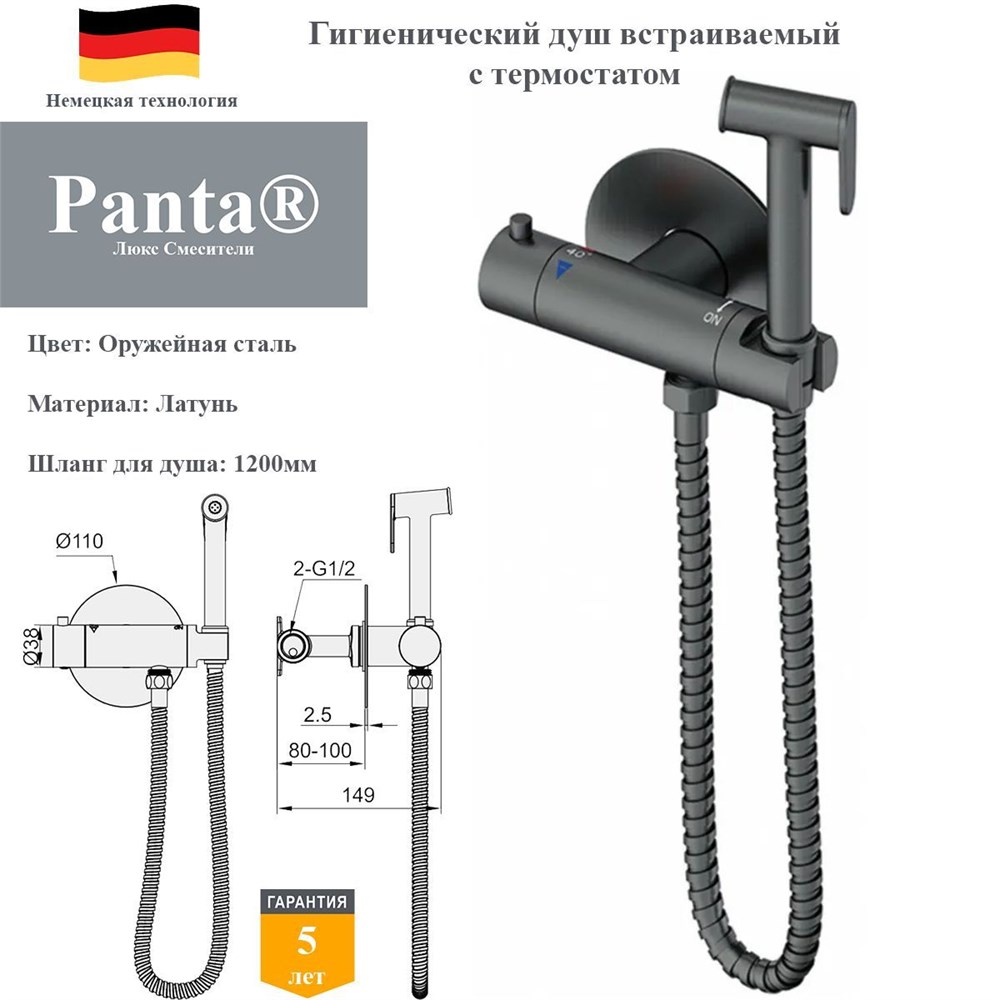Современное решение для комфортной и безопасной гигиены — гигиенический душ со скрытым монтажом и встроенным термостатом. Модель в благородном оттенке «оружейная сталь» сочетает передовые технологии, лаконичный дизайн и безупречное качество исполнения.