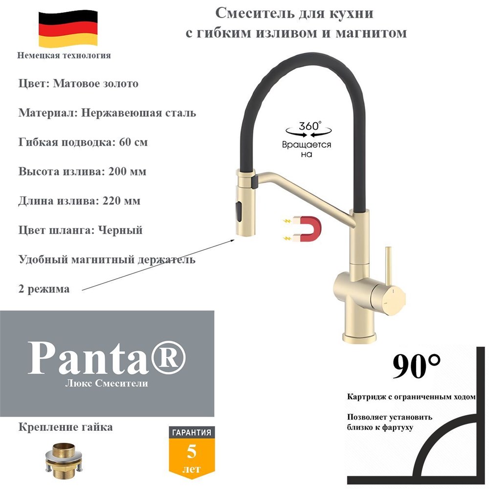 Смеситель для кухни с гибким изливом и магнитным держателям Panta PT438027BG(+B) матовое золото