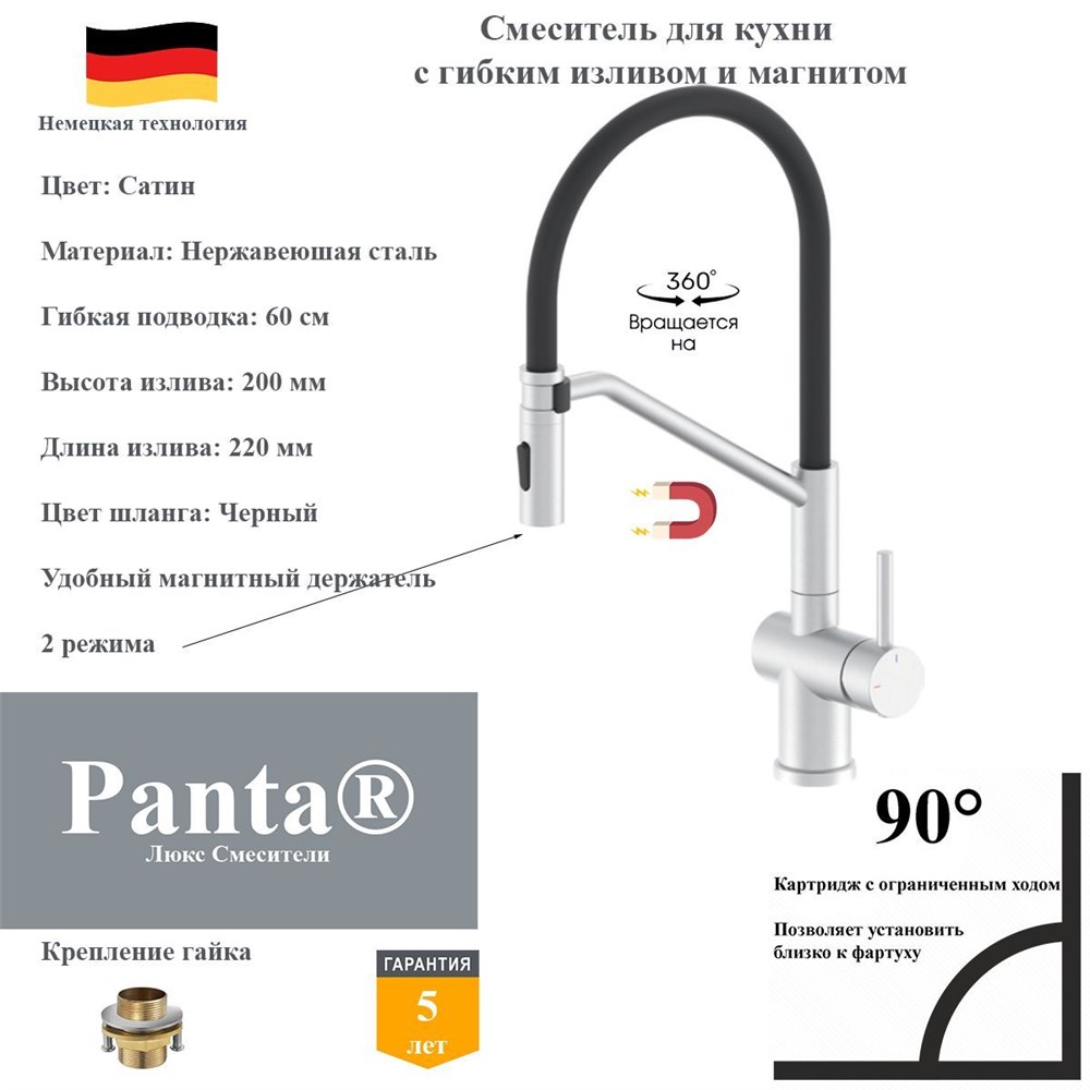 Смеситель для кухни с гибким изливом и магнитным держателям Panta PT438027BN(+B) сатин