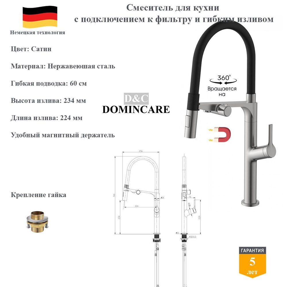 Смеситель для кухни с подключением к фильтру и гибким изливом D&C Domincare DC08645BN сатин