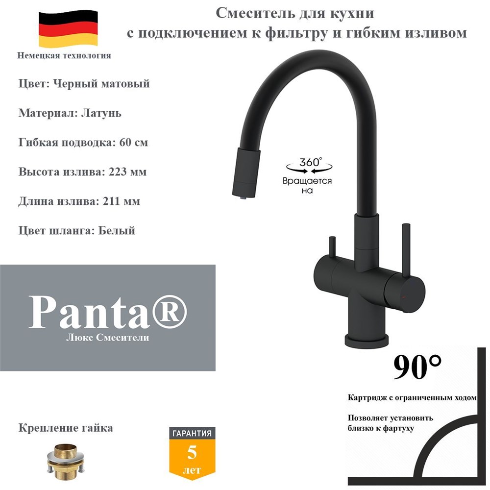 Смеситель для кухни с подключением к фильтру и гибким изливом Panta PT458002MB(+B) черный матовый