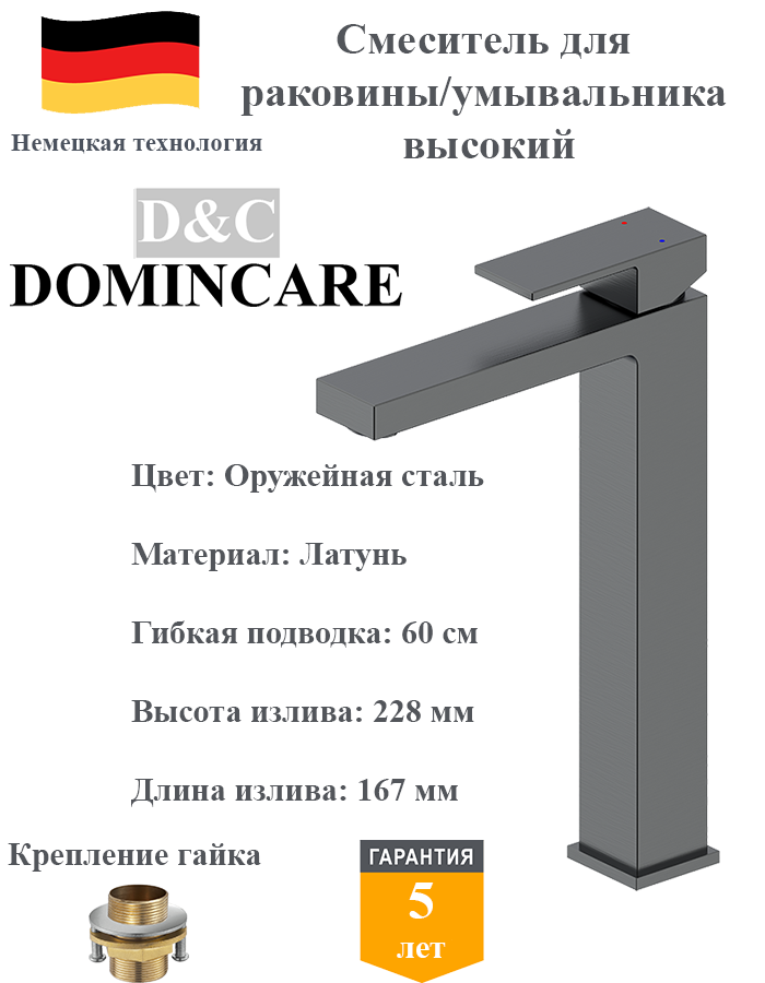 Смеситель для раковины высокий латунный D&C Domincare DC01912BGM «оружейная сталь»