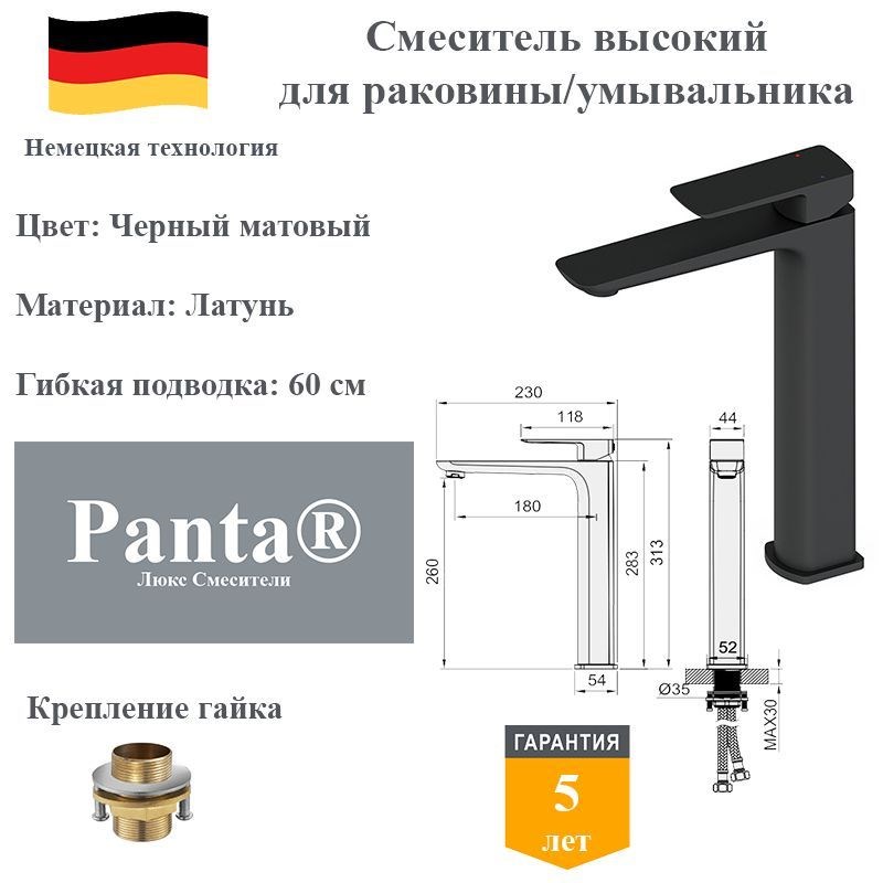 Смеситель для раковины высокий латунный Panta PT239003MB черный матовый