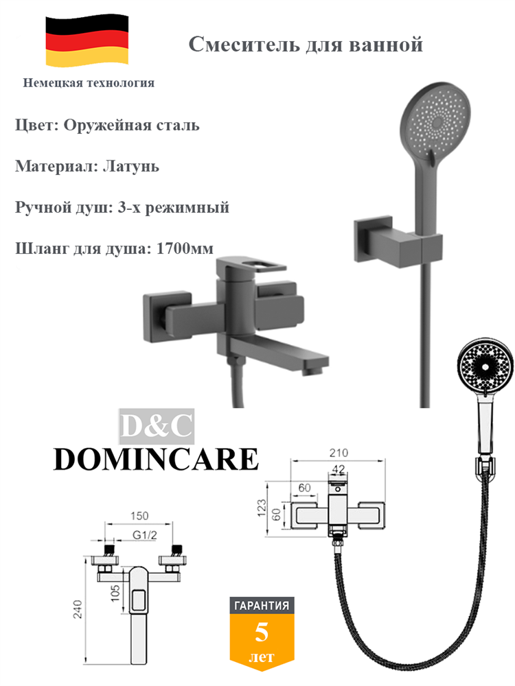 Смеситель для ванны со смесителем D&C Domincare DC01032BGM оружейная сталь