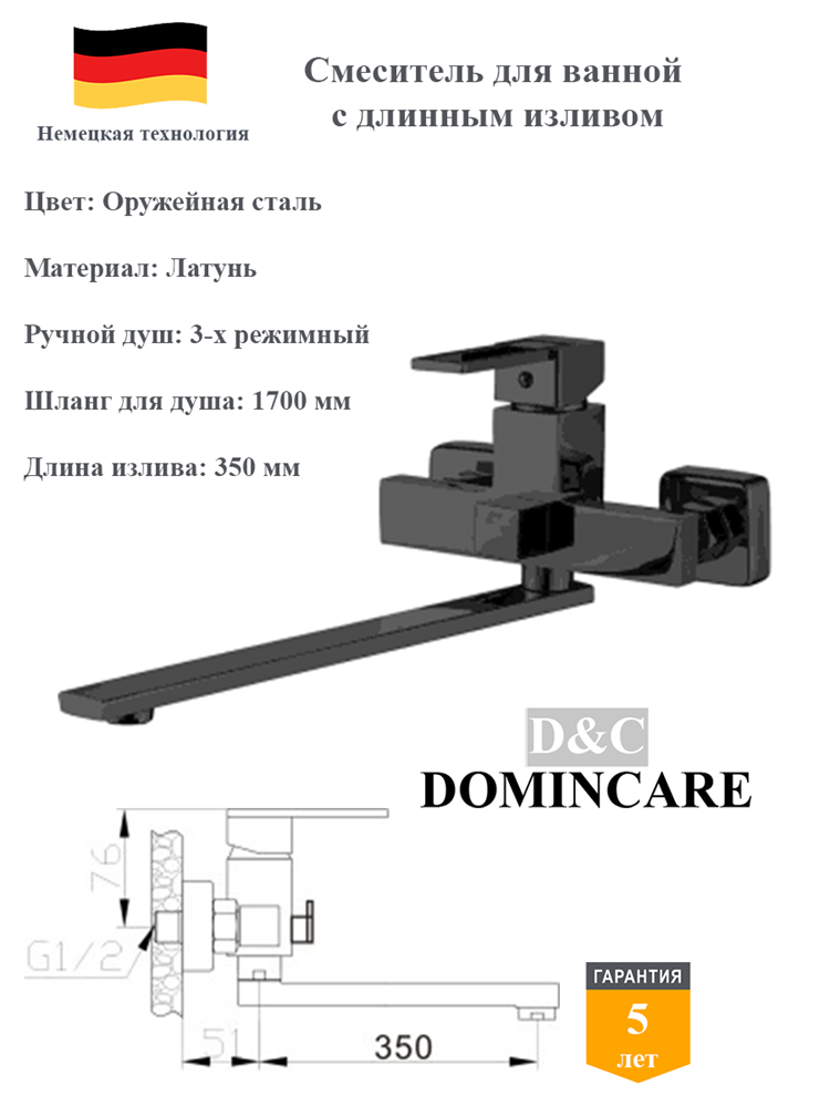 Главная особенность — настенный монтаж и многофункциональность: смеситель оснащён душевым гарнитуром и длинным изливом (350 мм), что обеспечивает удобство использования с ваннами разных конфигураций и глубины.