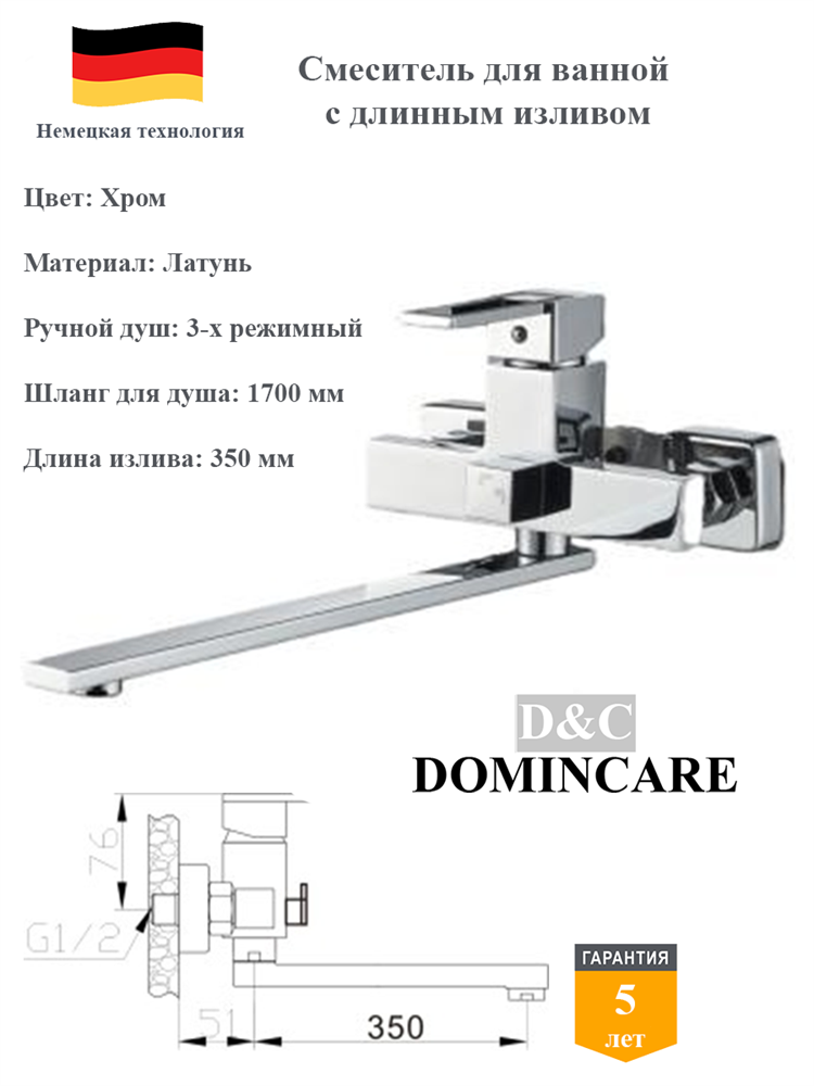 Главная особенность — настенный монтаж и многофункциональность: смеситель оснащён душевым гарнитуром и длинным изливом (350 мм), что обеспечивает удобство использования с ваннами разных конфигураций и глубины.